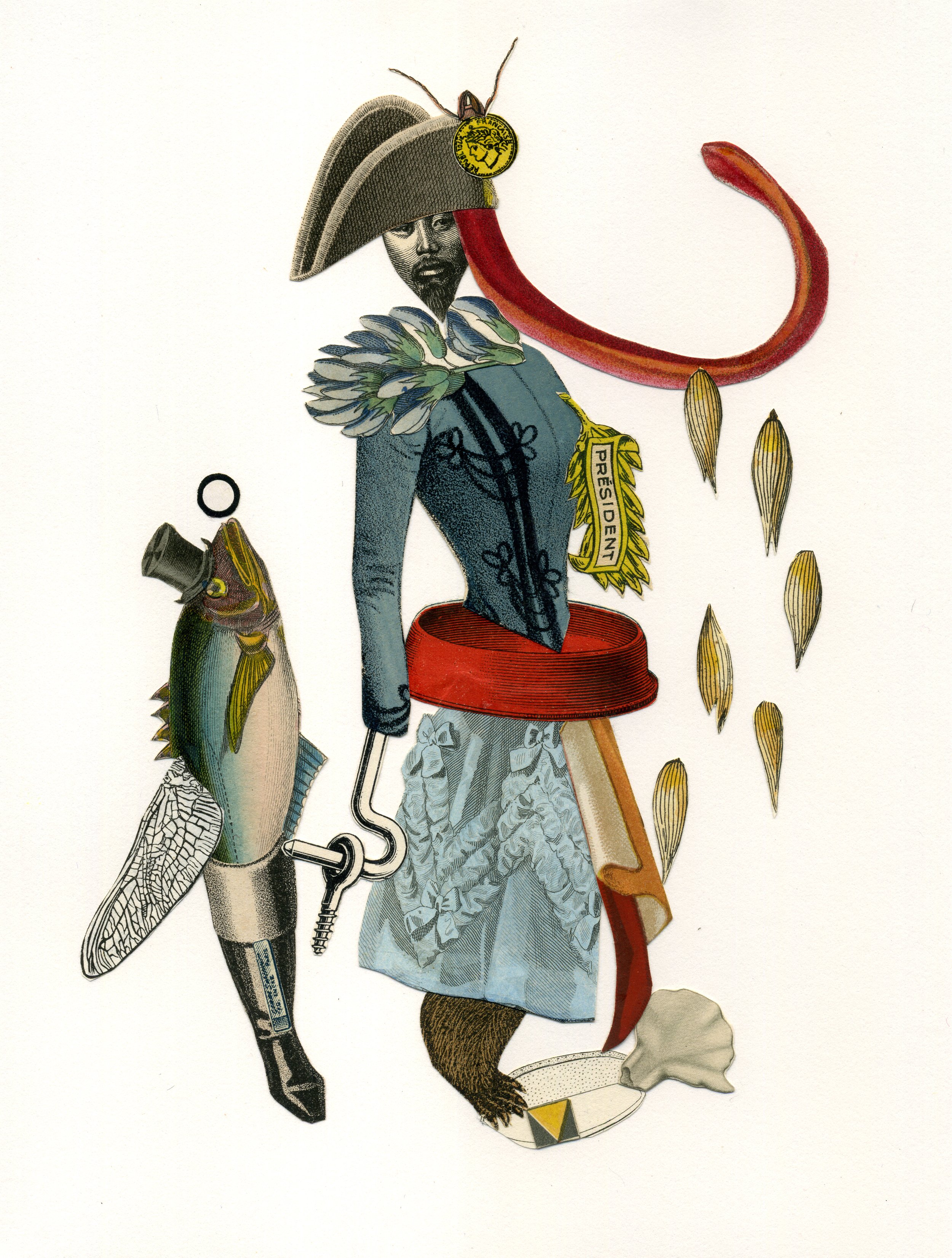 His collages and drawings on old papers and engravings depict wacky, grotesque, and eccentric characters who sometimes hide behind strange animals that he crafts with the brilliance of tenderness. His light and meticulous precision gives his creations the allusive force of a discreet poetry. Although we cannot predict today what the fruit of his disillusioned imagination will be, we can nevertheless predict that there will be more of it to come.